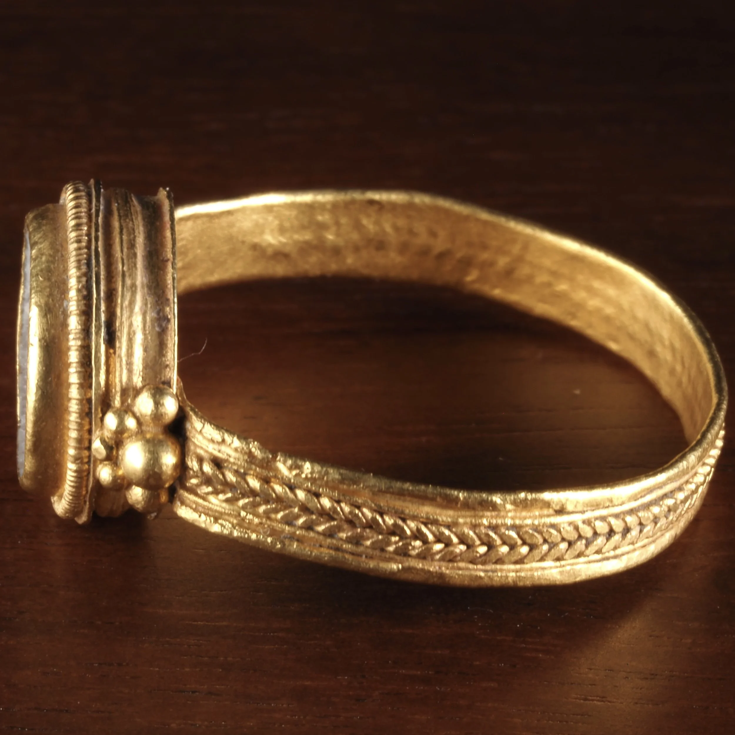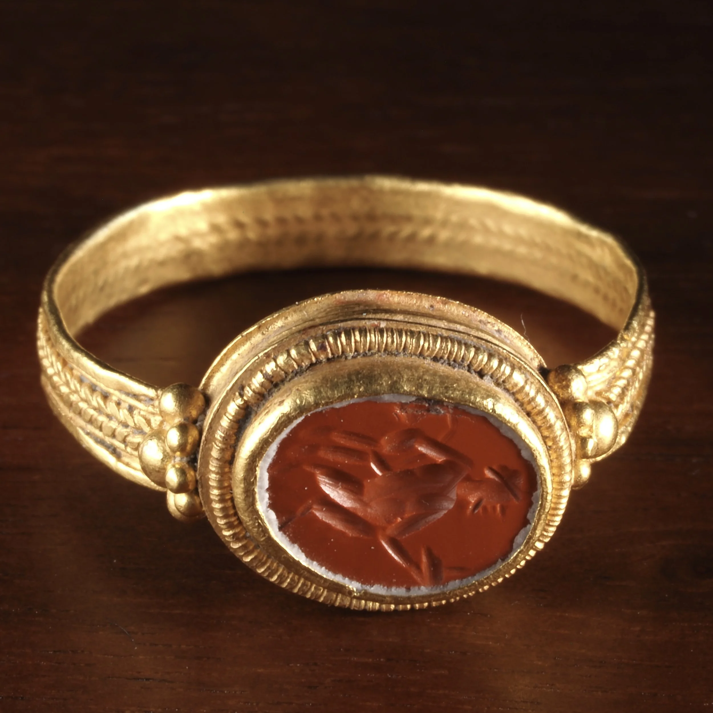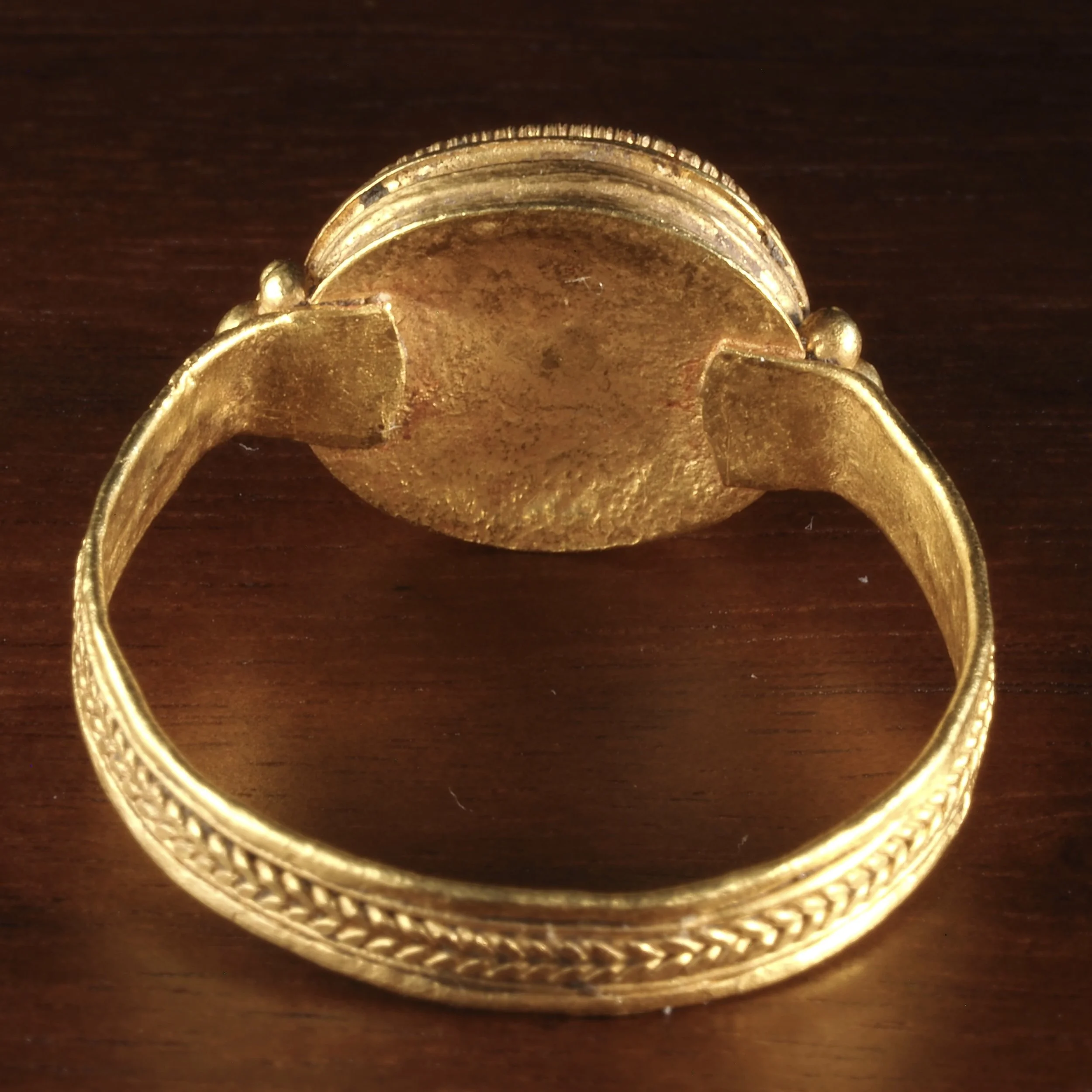 Ancient Roman gold and Jasper ring,Circa 1st Century B.C.- 3rd Century A.D.Depicting a dancing SatyrRing size: S 1/2 (UK) / 9 1/2 (US) / 60.5 (EU)22 carat goldProvenance:Private Collection Connecticut, acquired in the 1980s£3, 750 Enquire Return